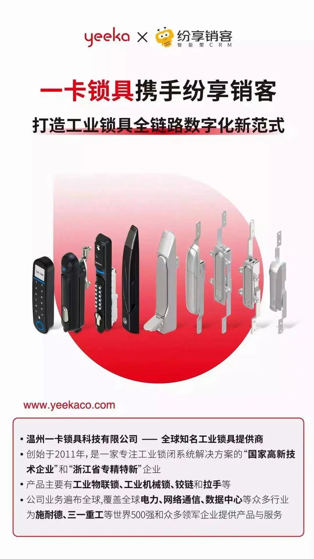 一卡锁具成立于2011年,是一家专注工业锁闭系统解决方案的“国家高新技术企业”和“浙江省专精特新”企业,产品涵盖工业物联锁、工业机械锁、铰链和拉手等。公司业务遍布全球40多个国家和地区,覆盖全球电力、网络通信、数据中心等众多行业,为施耐德、三一重工等世界500强和众多领军企业提供产品与服务。