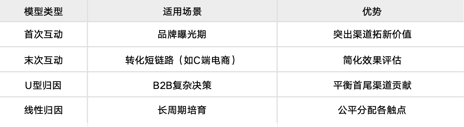 末次互动模型:100%归因最后一次触达渠道(适用于短周期转化)。