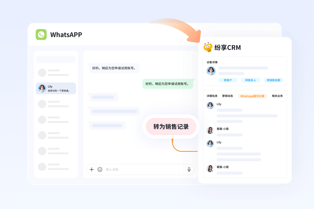 纷享销客营销云同时对接WhatsApp个人号/商户号和Business API。在个人号场景中,系统集成侧边栏可实时查看客户全维度画像;最新升级的SDR Agent接入WhatsApp后,AI能基于聊天上下文实时推荐专业话术,并将聊天中提取的客户信息(昵称、手机号等)自动映射到CRM线索字段,实现"5秒快速创建线索"。在API场景中,支持绑定多个公司统一营销号码,精准推送个性化营销消息。