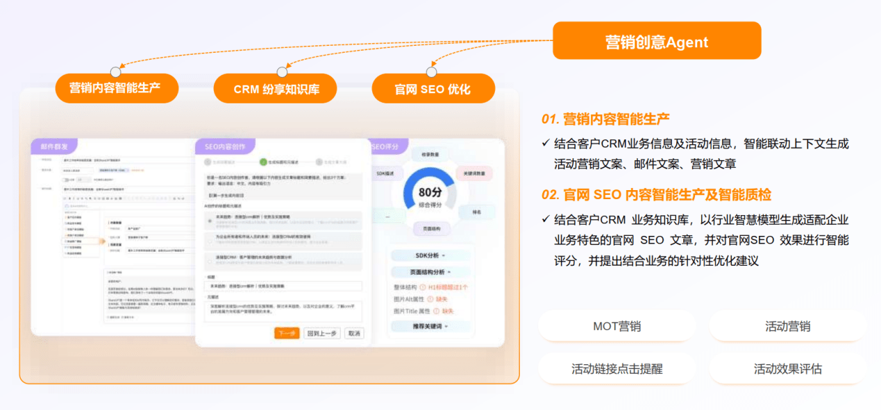 • 营销创意Agent:融合企业专有知识库,自动生成高质量的营销文案、孵化邮件序列及行业洞察,甚至对官网进行智能SEO诊断与评分。