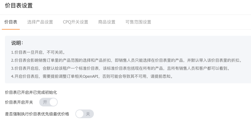 - 业务说明 :开启价目表后,系统将预设一个标准价目表,并且自动将现在所有产品添加到标准价目表明细中,默认折扣为100%。标准价目表不允许作废和删除,仅可启用禁用(价目表状态);标准价目表明细只允许编辑折扣,暂不允许增删价目表明细。