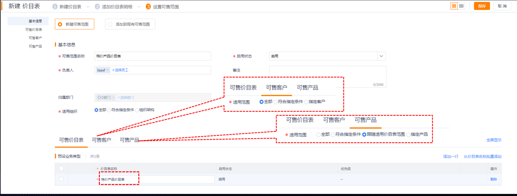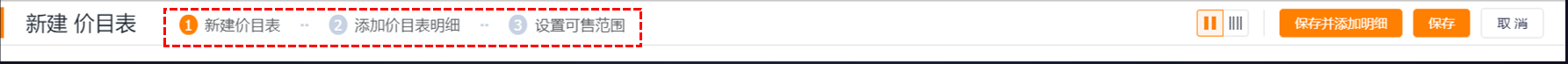 - 新建价目表快速维护可售范围:价目表 [ 新建 ] 界面,从价目表新增到价目表明细维护,最后到可售范围创建,分布引导直观可见;