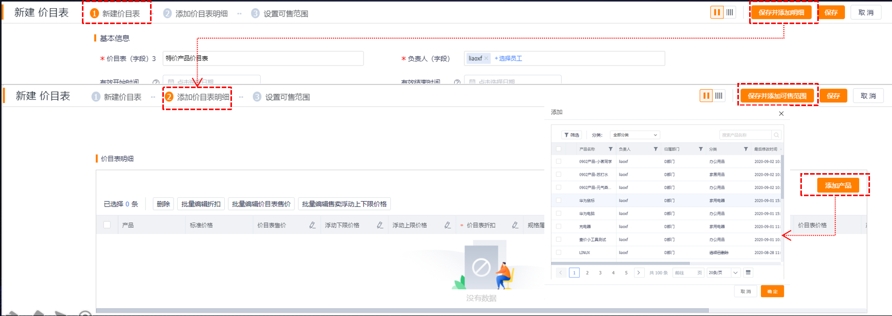 - 业务操作入口 :【价目表】编辑页的”保存并新建价目表明细“【价目表】详情页面中的“价目表明细”;【价目表明细】对象中点击“添加产品”。