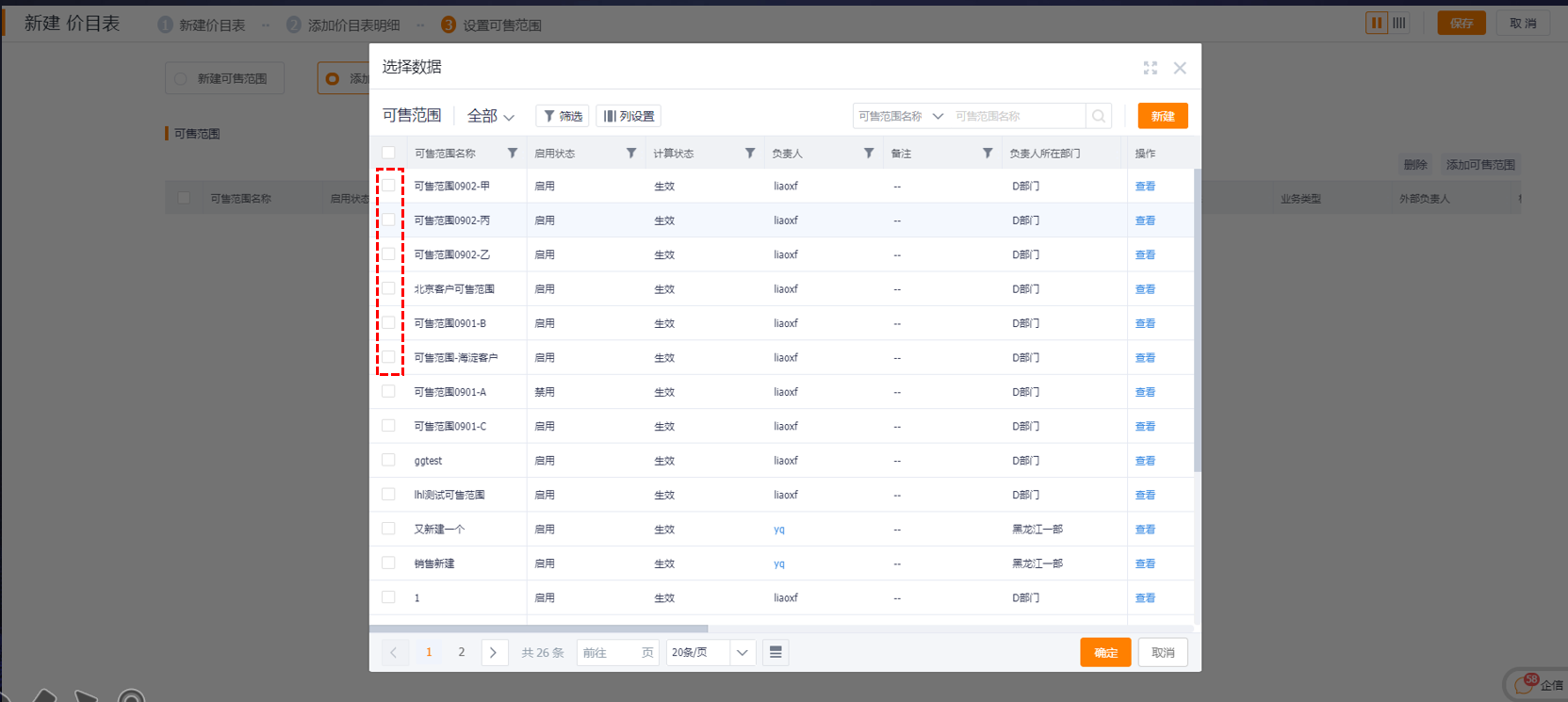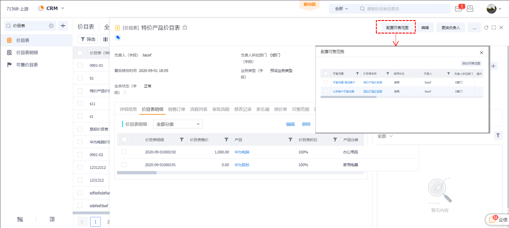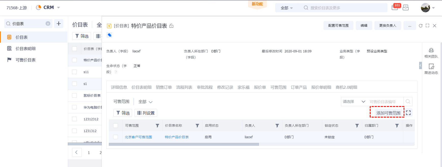- 第二步:CRM-可售范围-可售价目表:添加新增的价目表