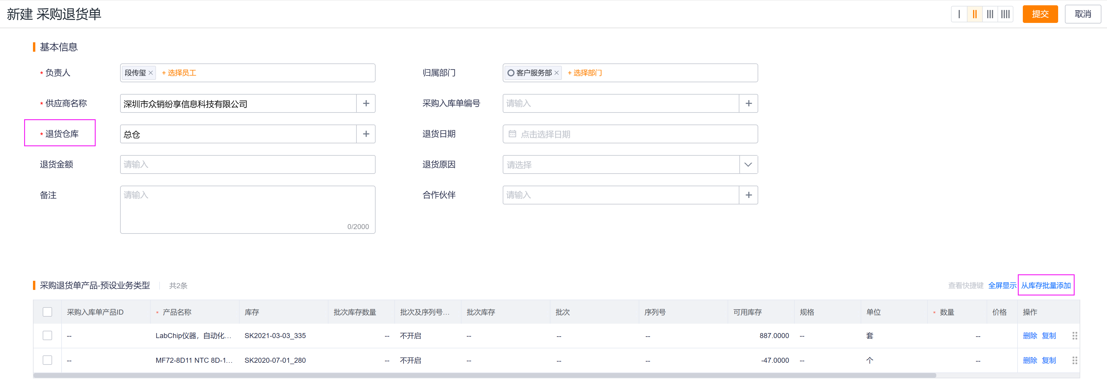 - 不基于采购入库单退货的情况下,新建采购退货单时,采购退货单产品,需要从所选“退货仓库”的“库存”当中选择。