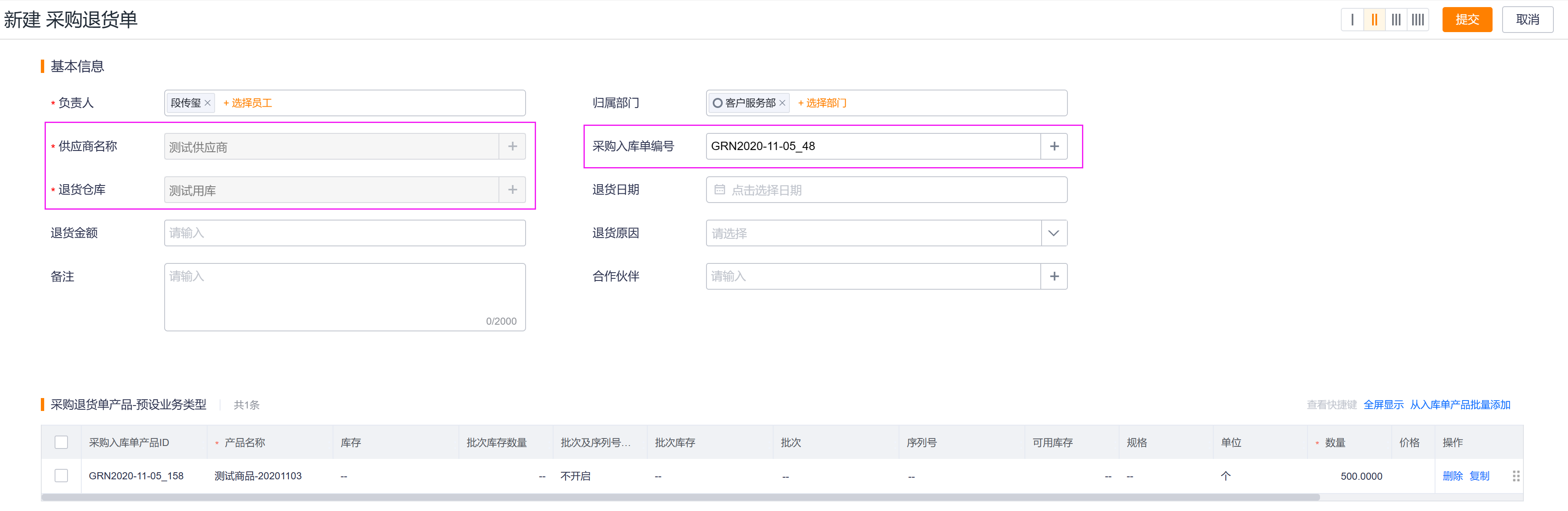 - 基于采购入库单退货的情况下,当选择了采购入库单后,系统会自动将对应的供应商名称、退货仓库填入,且不允许修改。