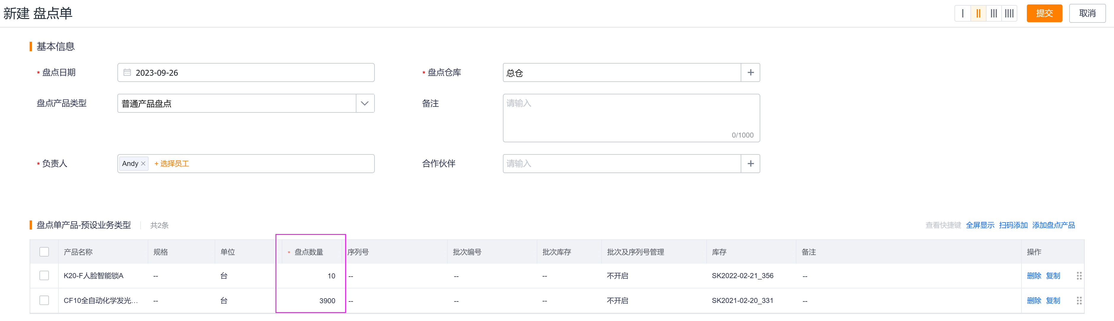 - 新建盘点单时,如果选择的是预设业务类型,则对应的是明盘模式,明盘模式下,会显示盘点单产品的系统数量及盘盈盘亏数量