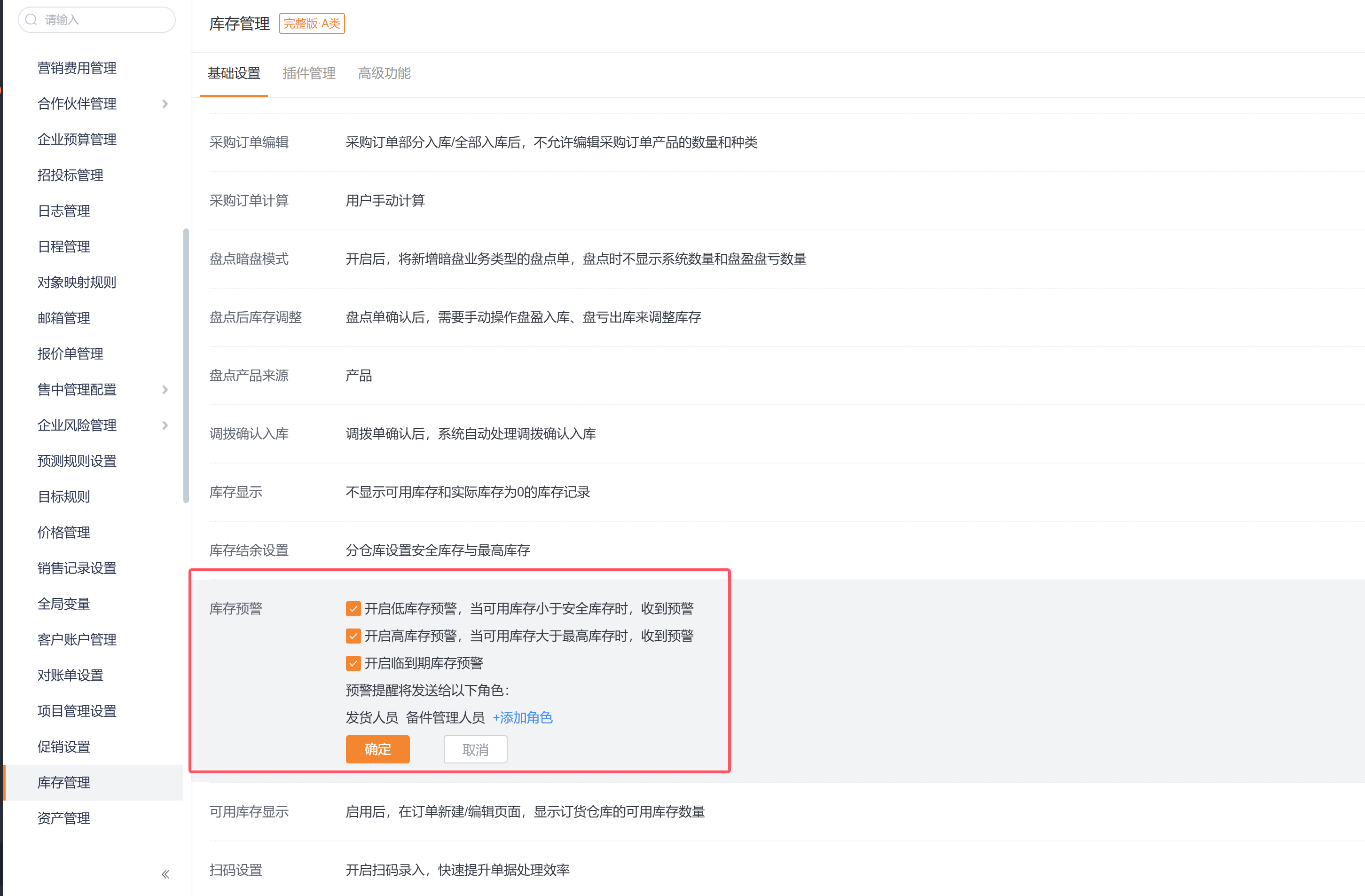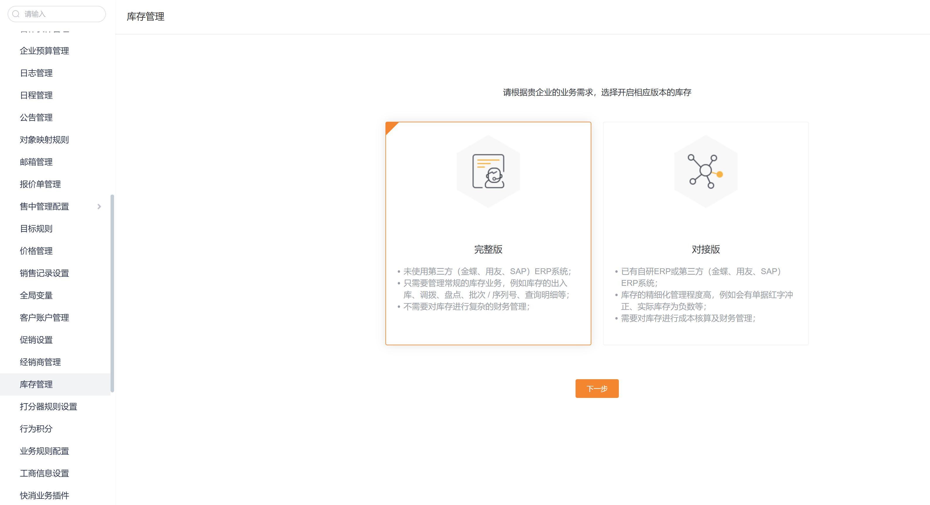 开启路径:CRM管理后台->CRM平台管理->业务规则管理->库存管理。
