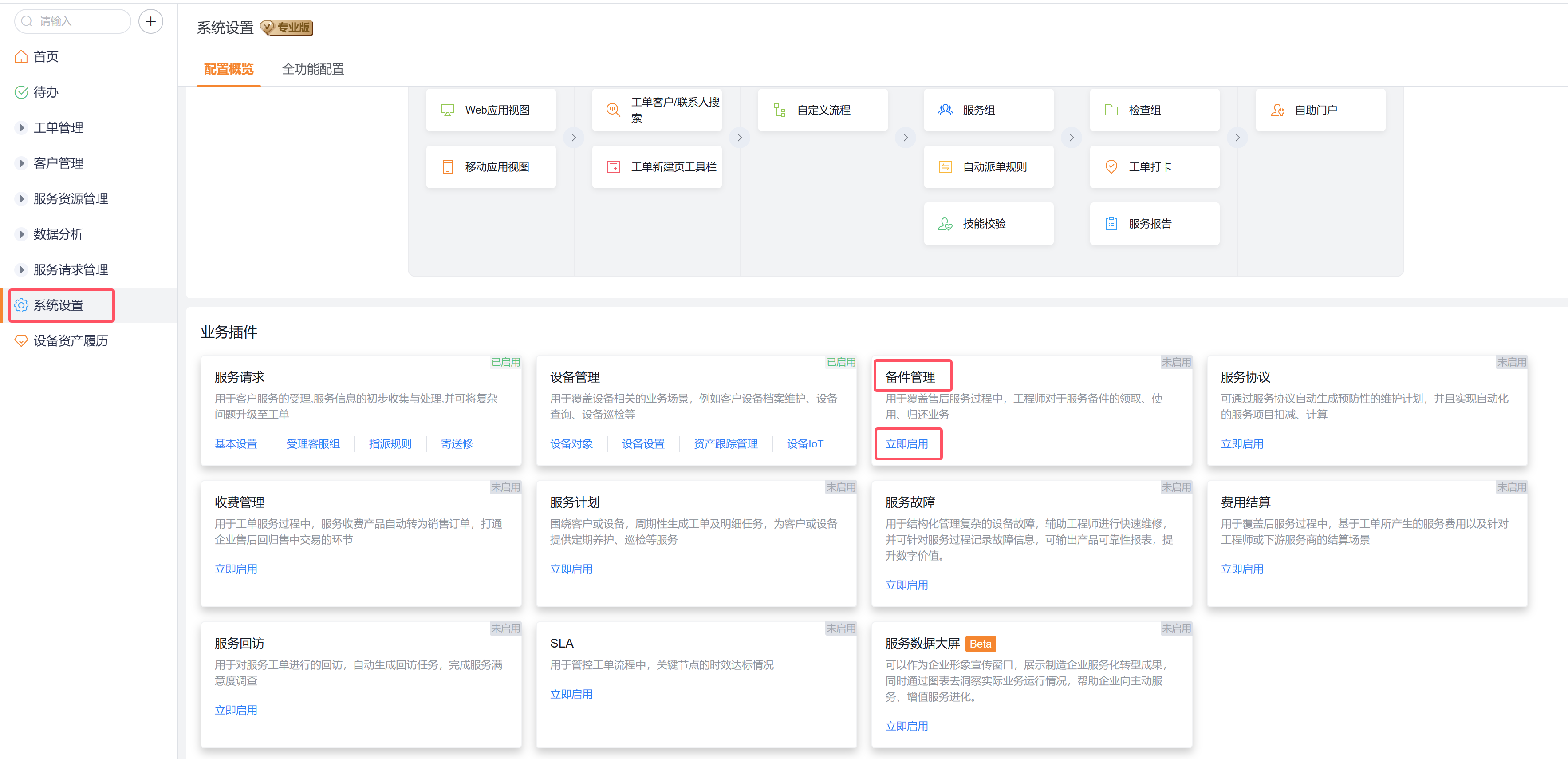 路径:服务通应用->系统设置->业务插件->备件管理。