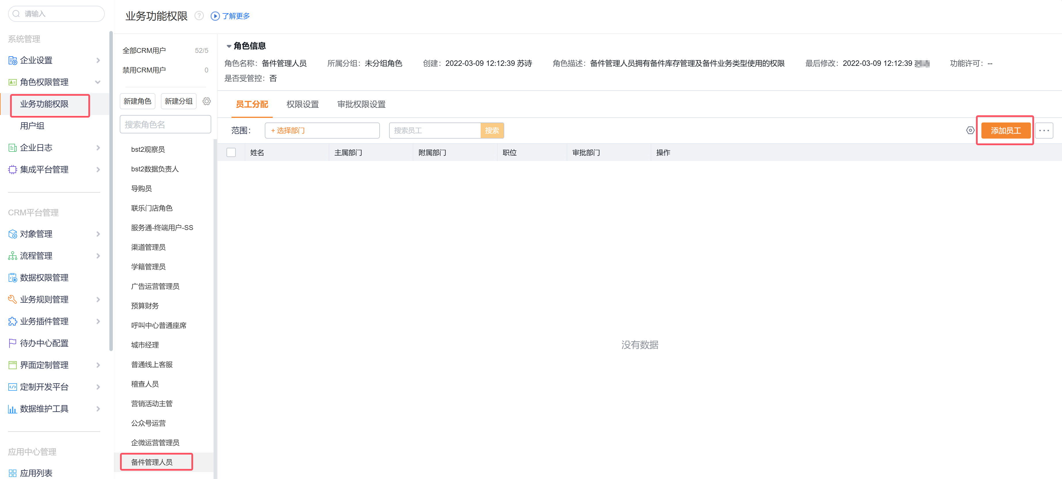 在使用备件库存之前,需要给对应的角色分配仓库的备件业务类型,路径为:CRM管理后台->CRM平台管理->对象管理->预设对象管理->仓库->业务类型->分配业务类型。