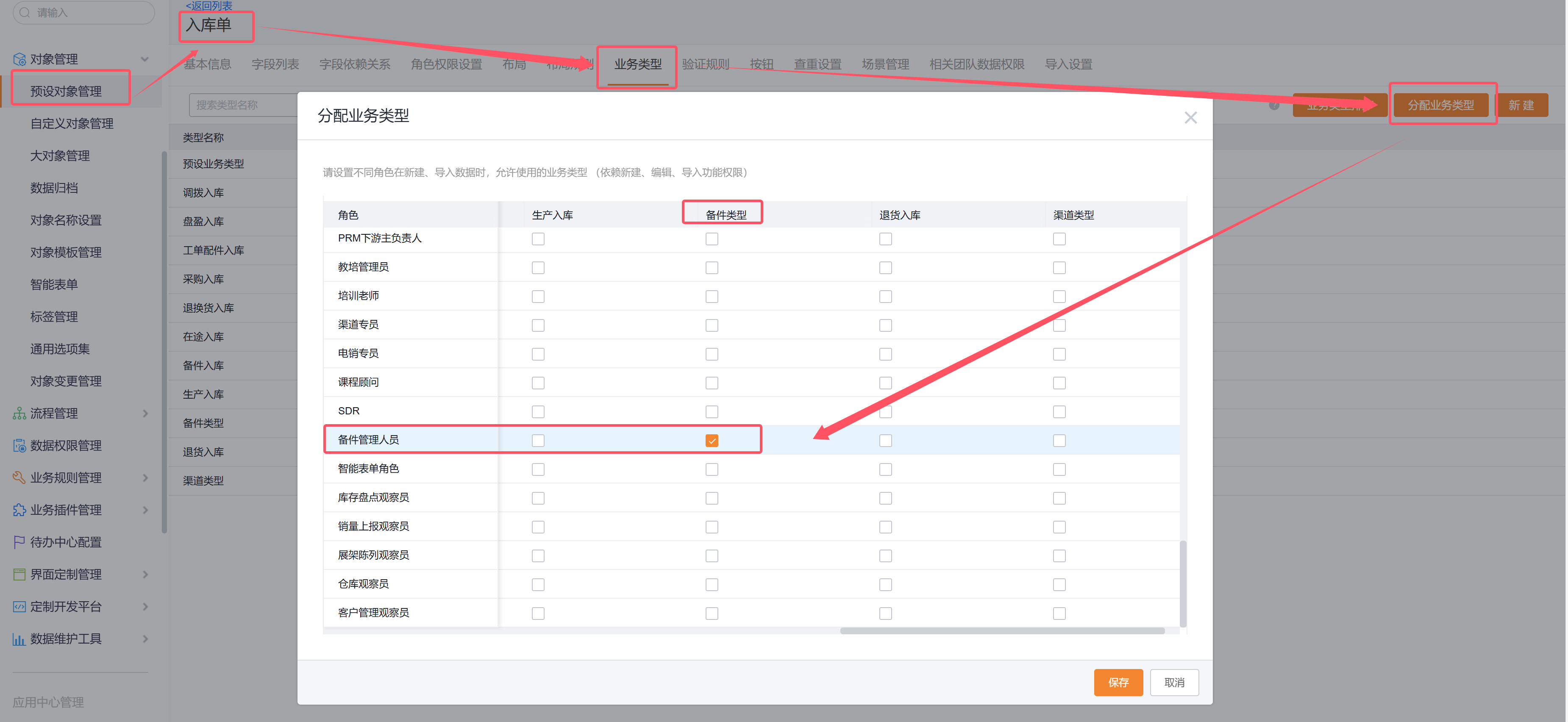 在使用备件的单据之前,需要给对应的角色分配对应单据的业务类型,以入库单为例,路径为:CRM管理后台->CRM平台管理->对象管理->预设对象管理->入库单->业务类型->分配业务类型。