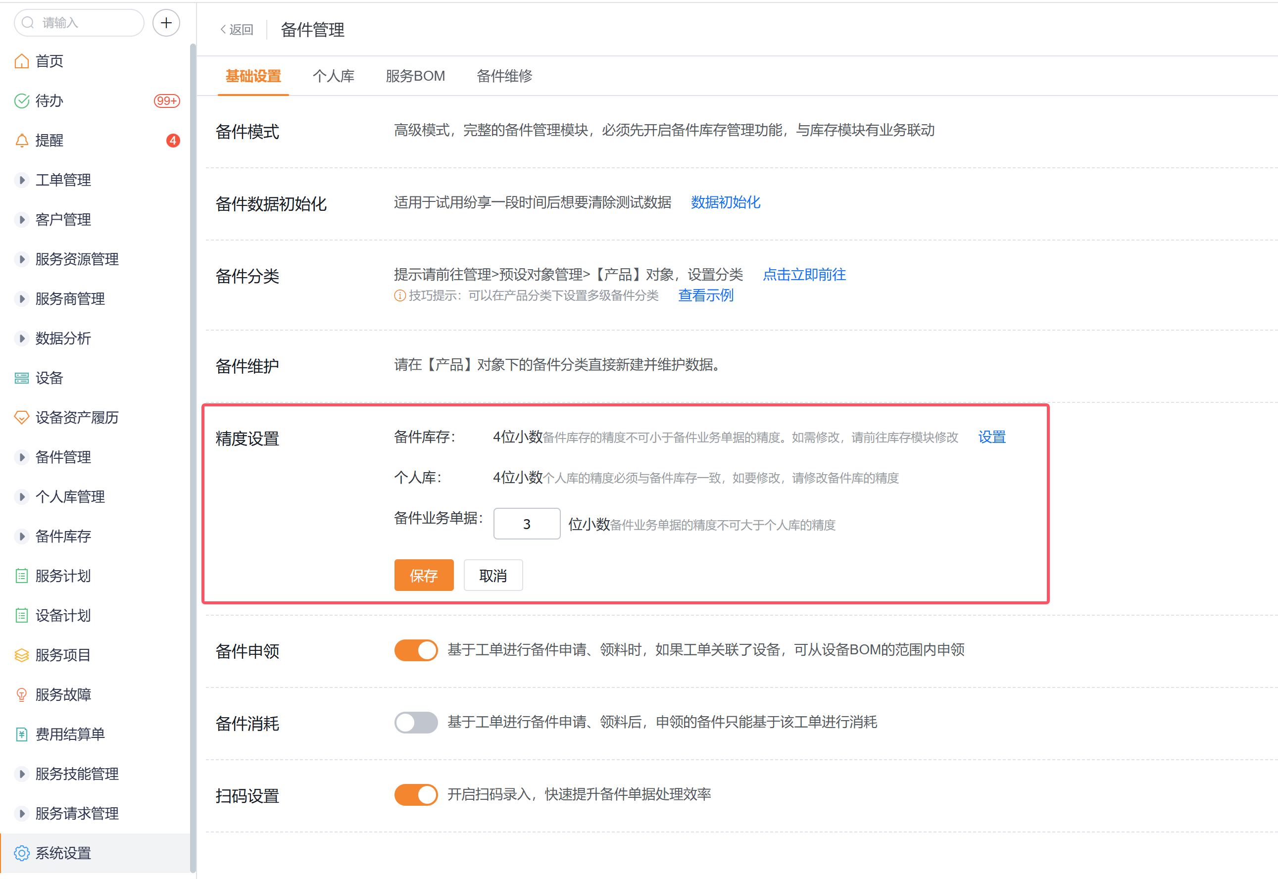 在正式开展备件业务之前,如有需要可先设置备件库存、个人库、备件业务单据的精度,系统默认均为2位。