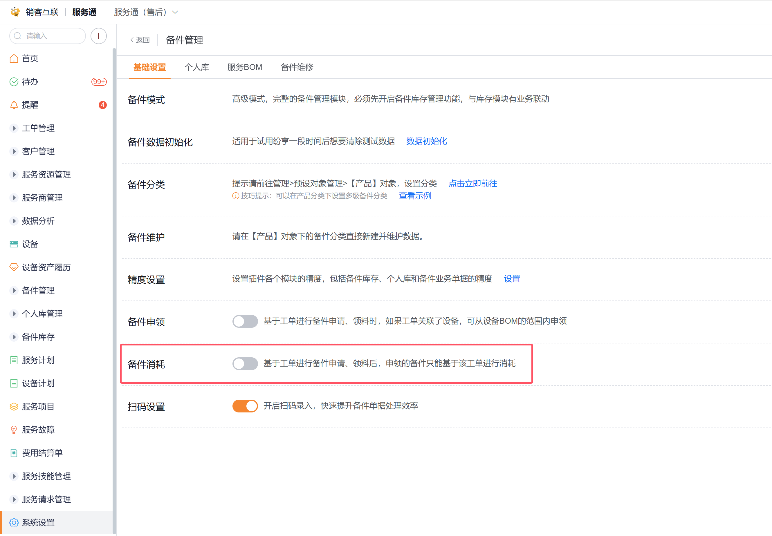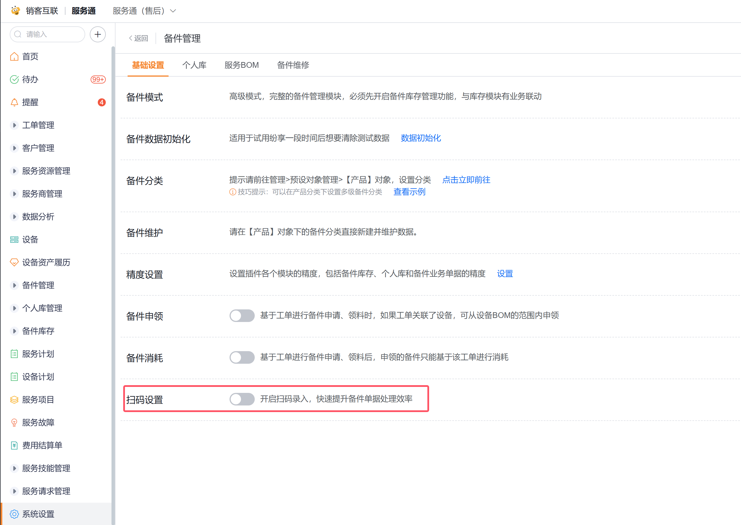 路径:服务通应用->系统设置->业务插件->备件管理->基础设置。