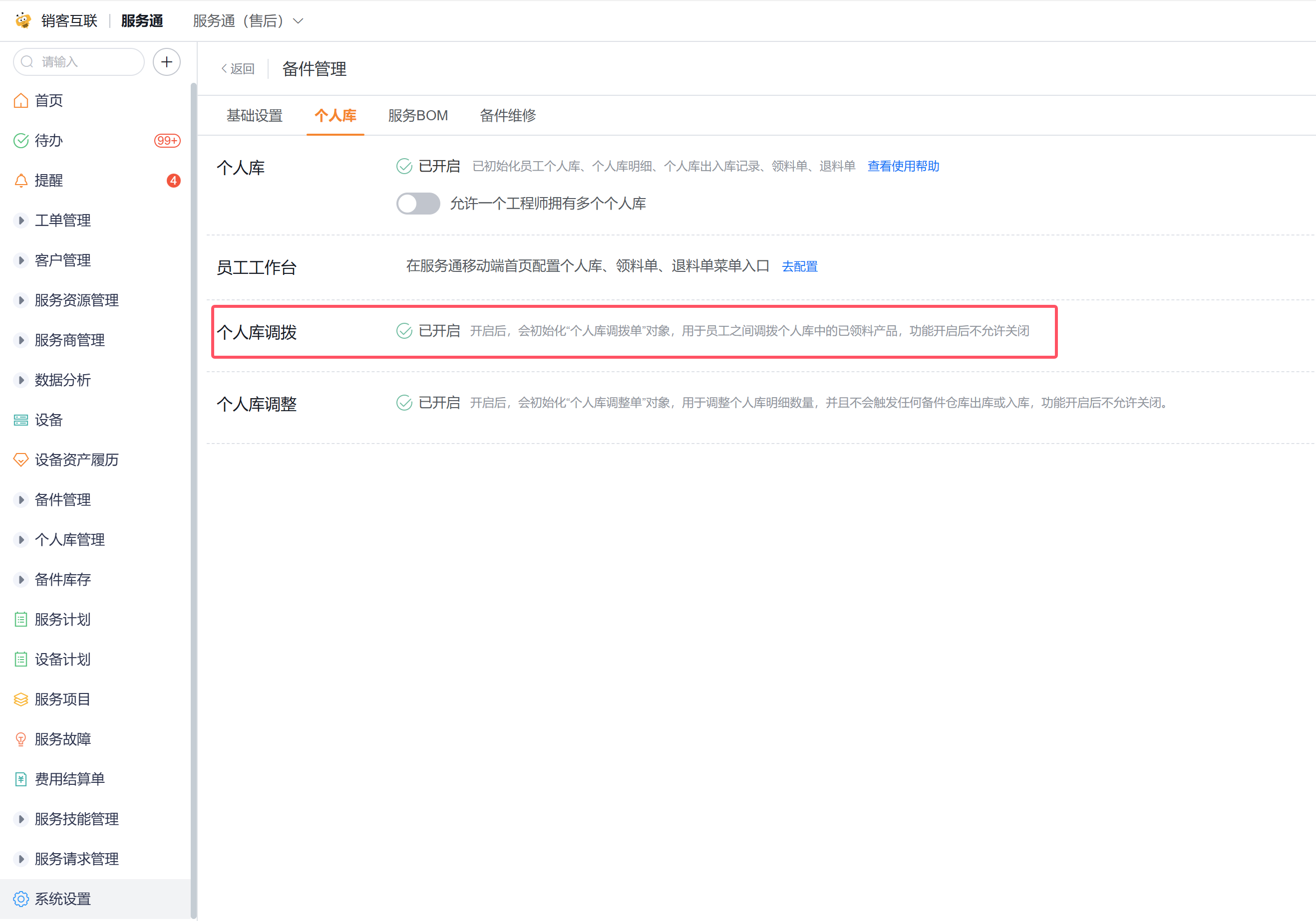 个人库调拨单默认未启用,如果需要在不同的工程师之间进行个人库备件的调拨,则需要开启个人库调拨,如上图所示,开启路径为:服务通应用->系统设置->业务插件->备件管理->个人库。