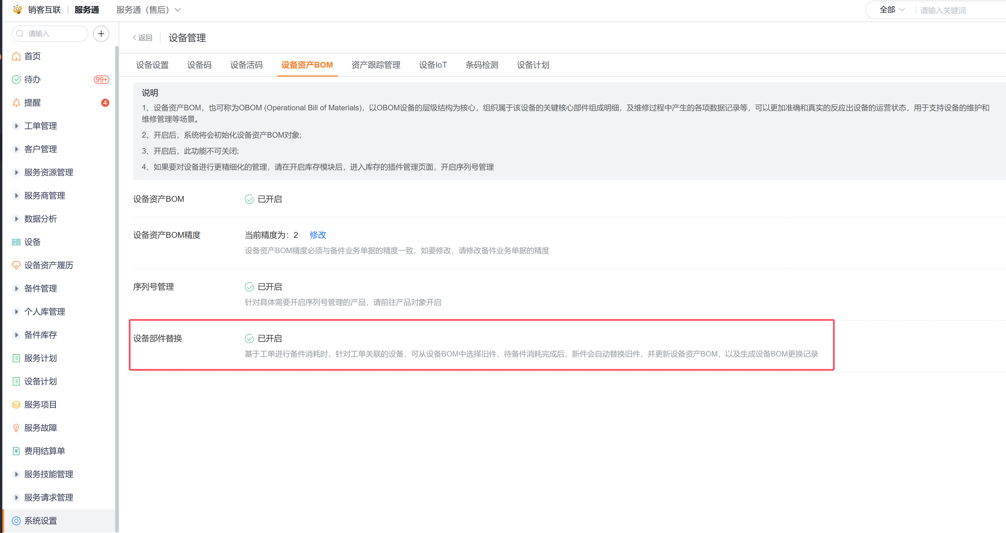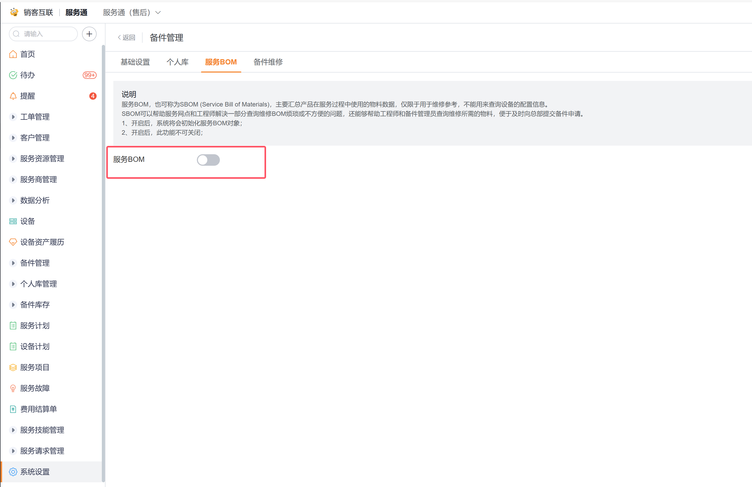 如果需要基于服务BOM进行备件申领,可开启服务BOM,如上图所示,开启路径为:服务通应用->系统设置->业务插件->备件管理->服务BOM。