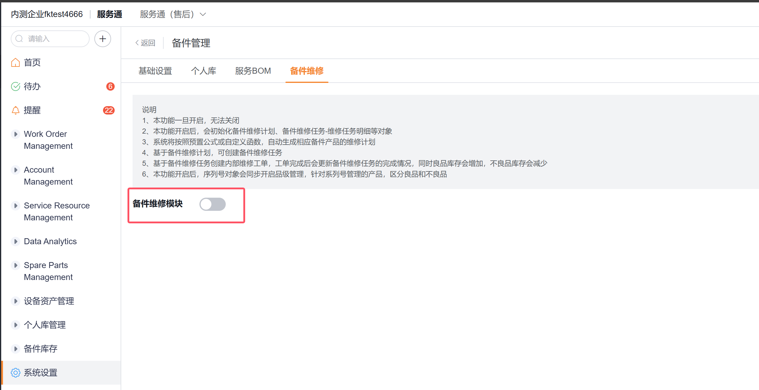 开启路径:服务通应用->系统设置->业务插件->备件管理->备件维修。