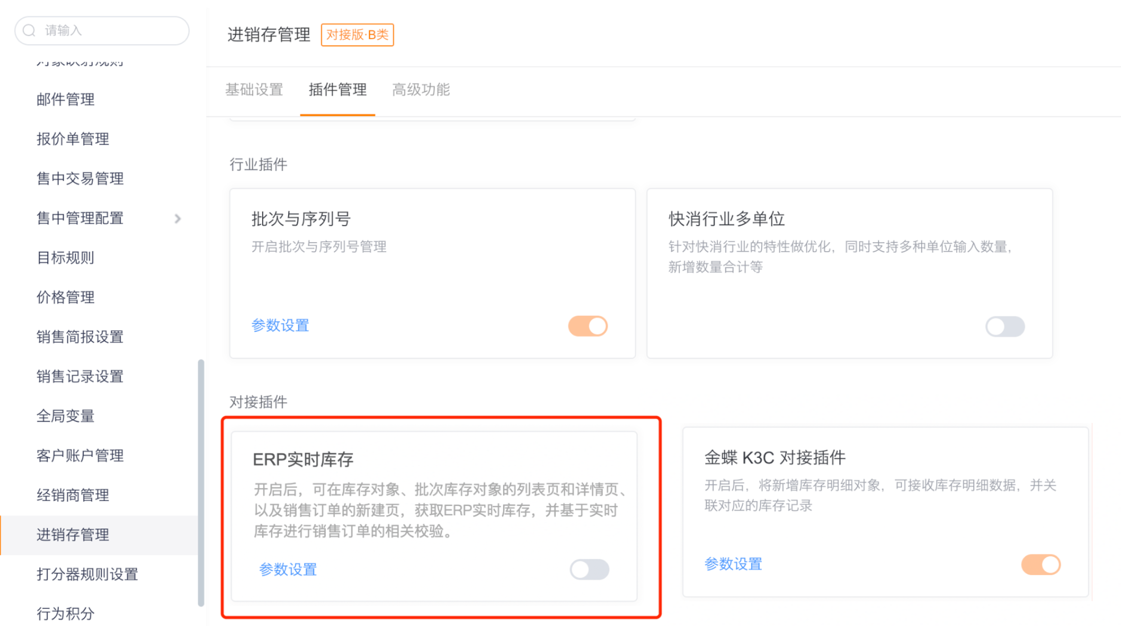 - 插件开启路径:进销存管理-插件管理-对接插件:“ERP实时库存”。