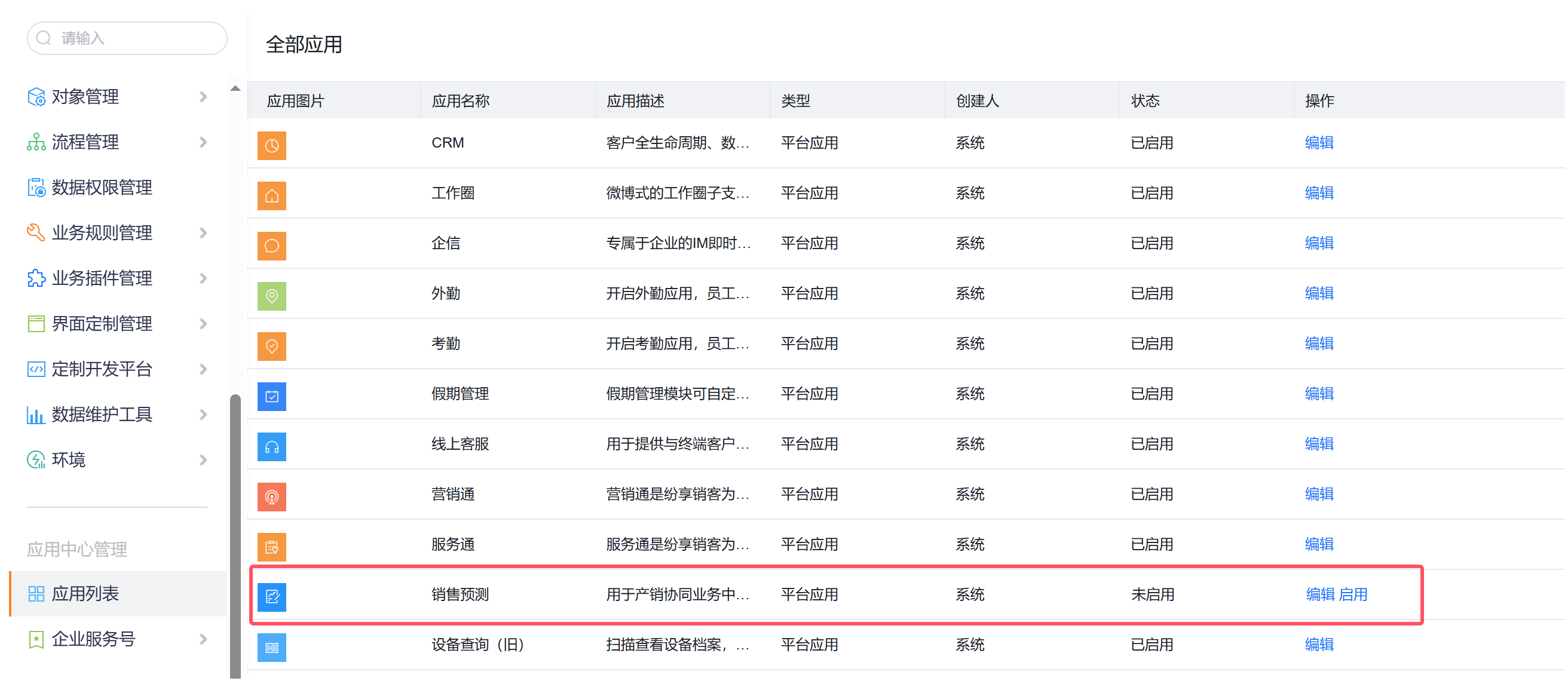 - 进入管理后台,在应用中心管理->应用列表中,找到销售预测应用,然后启用。