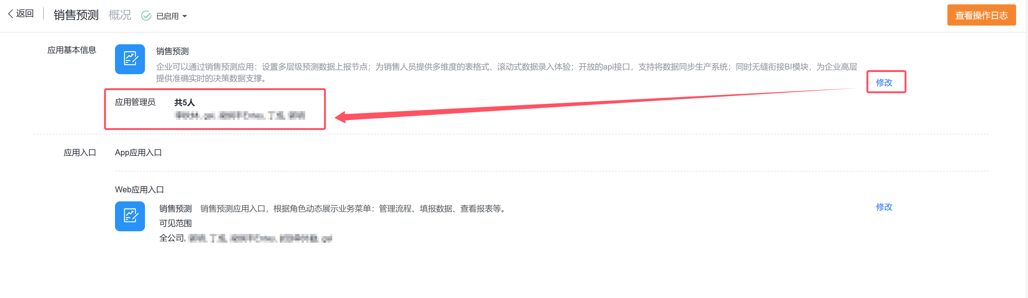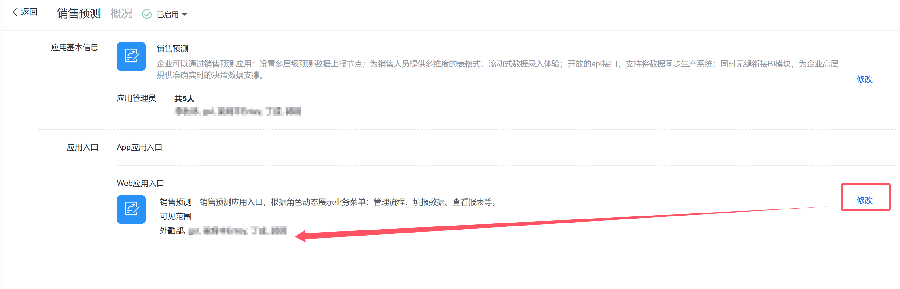 - 点击修改,设置销售预测的Web应用入口,可按部门选择,也可以选择具体的员工。