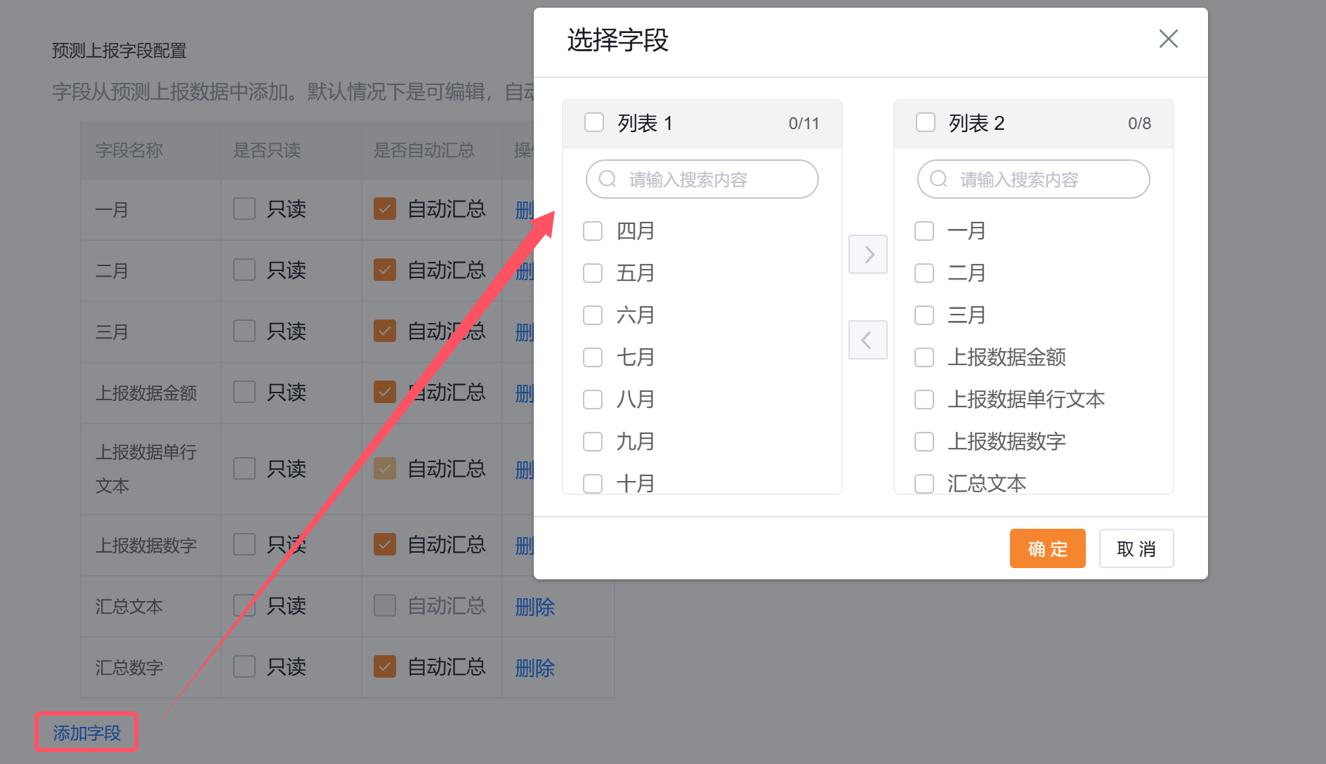 - 点击添加字段,可在弹出框内选择需要的字段,并设置是否只读、是否自动汇总。