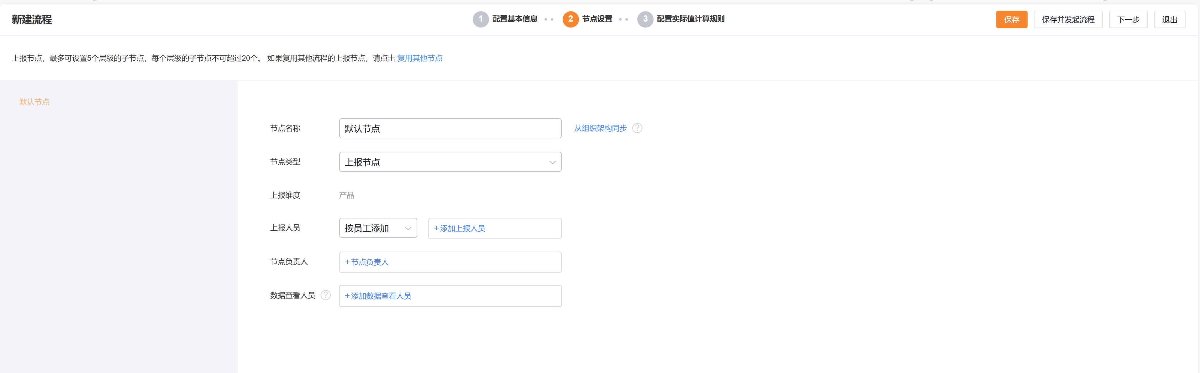 - 上报节点:需上报数据的人员,均维护在上报节点中;节点负责人用于审核当前节点所有的上报数据。
