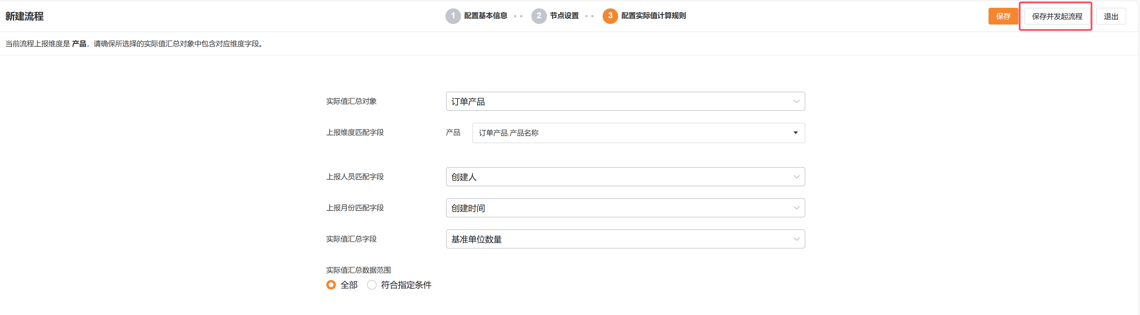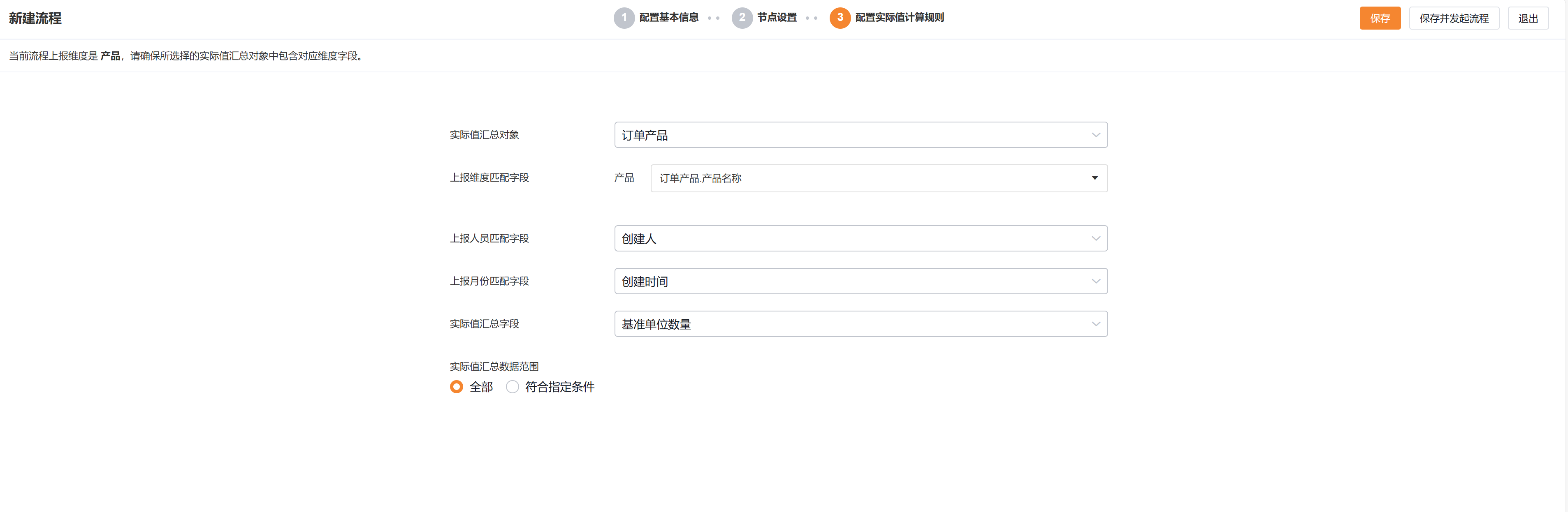 - 上报维度匹配字段:根据当前流程的上报维度动态显示维度值以及前后顺序,允许选择的范围是实际值汇总对象中的客户/产品的查找关联字段;