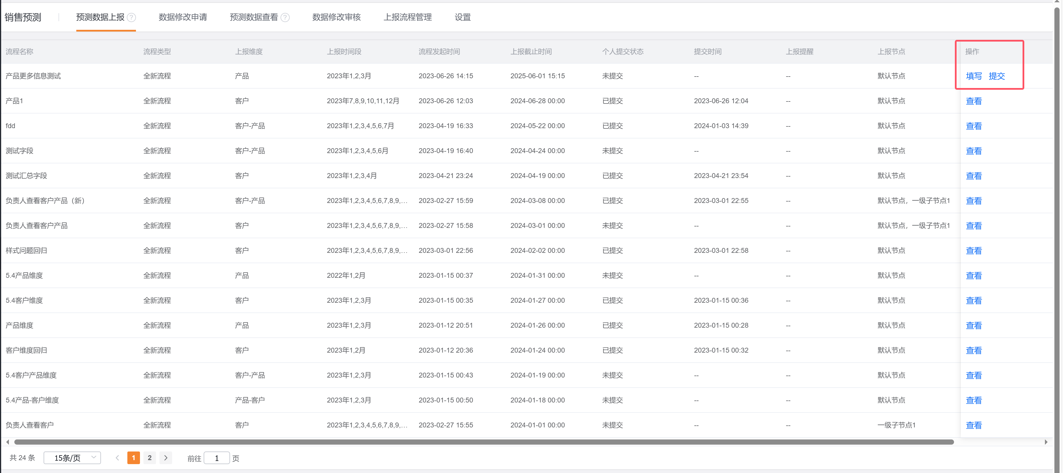 - 在预测数据上报列表中,选择需要操作的流程,点击【填写】进入填写页面;