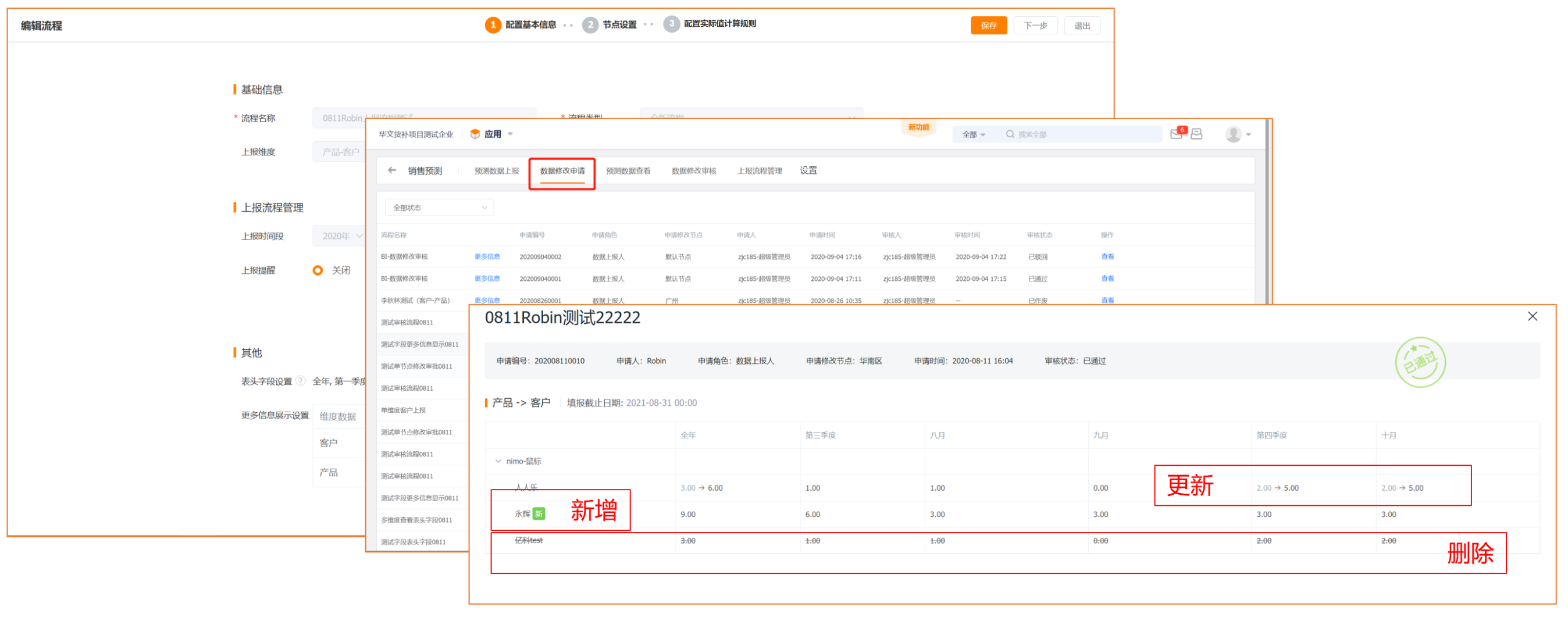 - 上报人员在【提交】数据后,如需修改数据,系统会根据当前流程管理中的审核设置判定是否发起流程: